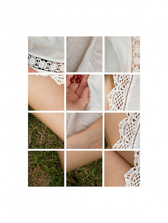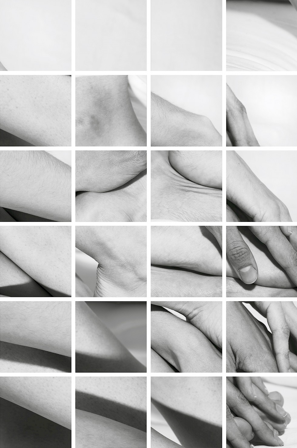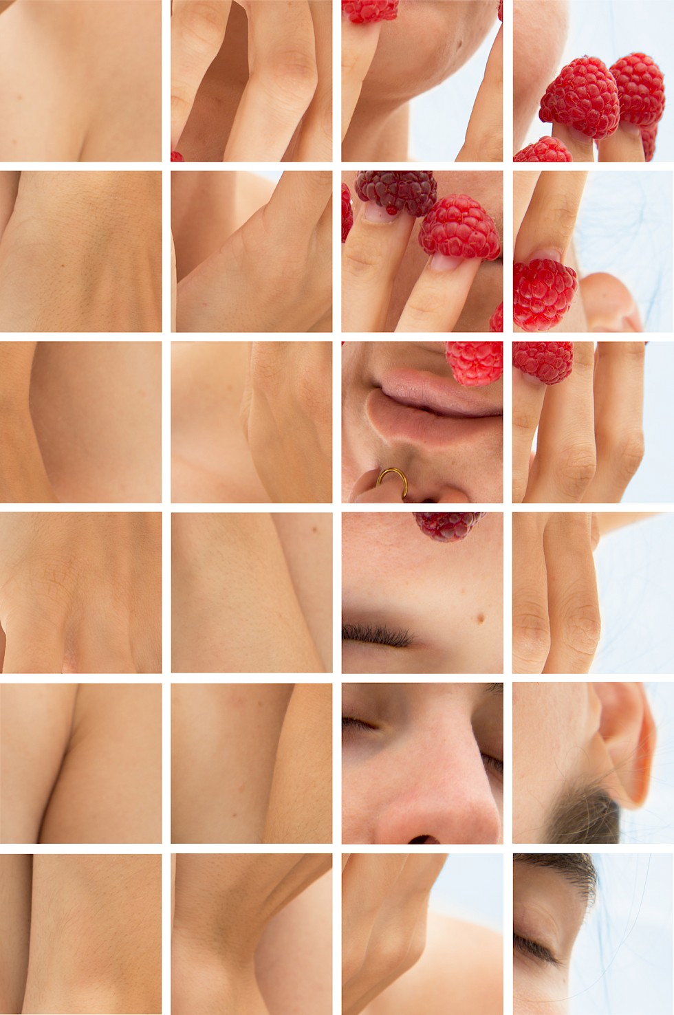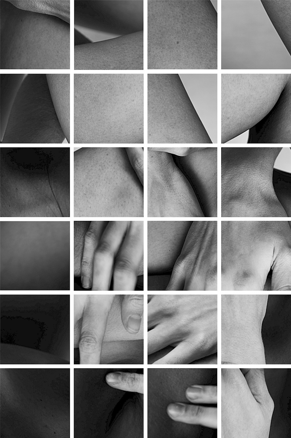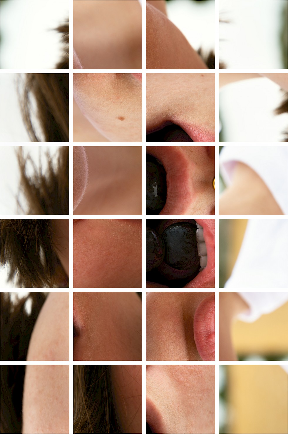 +Die Arbeit „24“ zeigt eine Reihe von Selbstportraits, die sich zunächst nicht als solche offenbaren. Vielmehr scheinen es abstrakte Darstellungen eines Selbst, welches erst aus dem Inneren enträtselt werden kann. Jedes Bild besteht aus 24 scheinbar willkürlich zusammengesetzten Quadraten einer Fotografie, die jedoch nach individuellen Regelsystemen arrangiert wurden. Diese Regeln zum Aufbau des Bildes sind vielfältig und übersetzen eigene persönliche Handlungsweisen (ich neige beispielsweise dazu Lebensmittel nur in geraden Anzahlen zu konsumieren) in eine Bildkomposition. Mein innerer Drang nach Ausgeglichenheit und der Zwang Alltägliches in geraden Zahlen zu zerlegen, lässt auch im Bild aus Fragmenten etwas Ganzes entstehen. Die Ambivalenz des Chaos und der Ordnung in den Arbeiten spiegelt so den Zustand eines Lebens wieder, welches sich zugleich unter Kontrolle befindet als auch von absurden Regeln kontrolliert wird.
